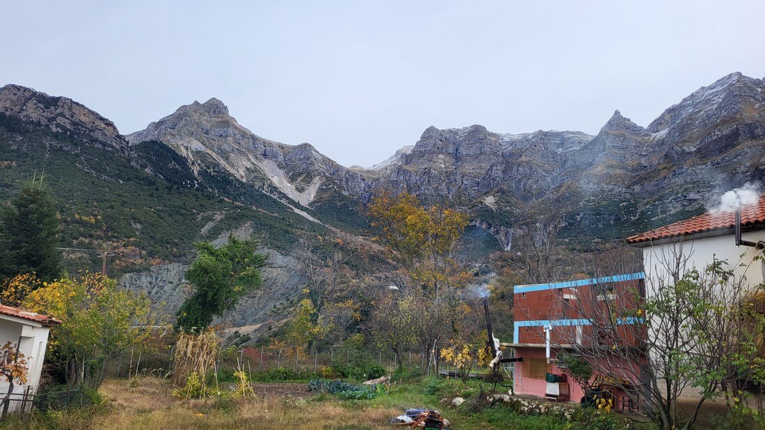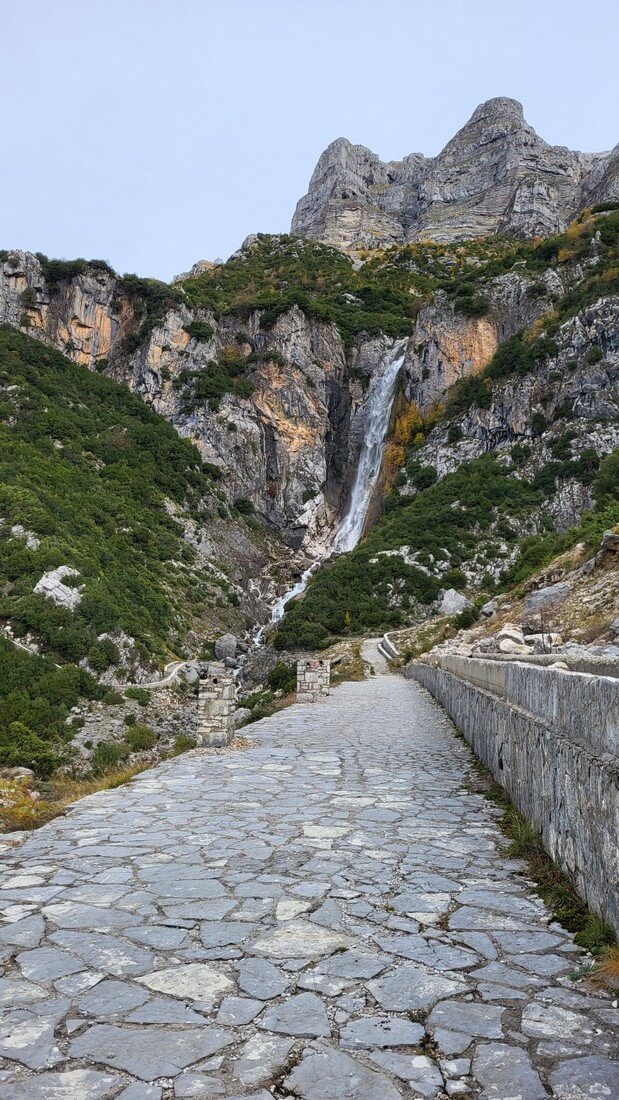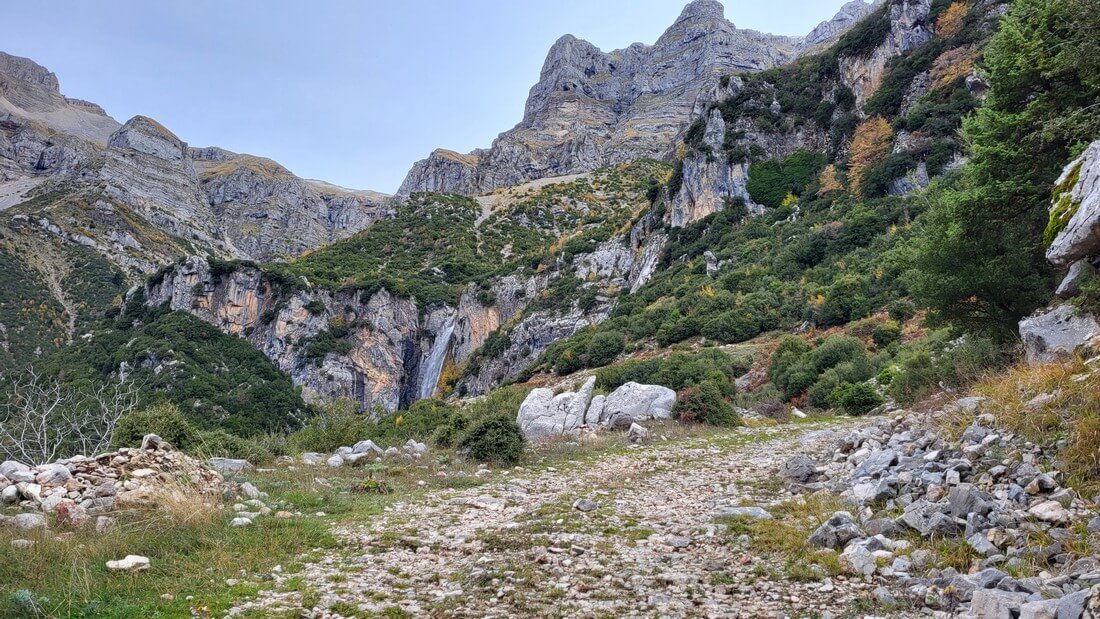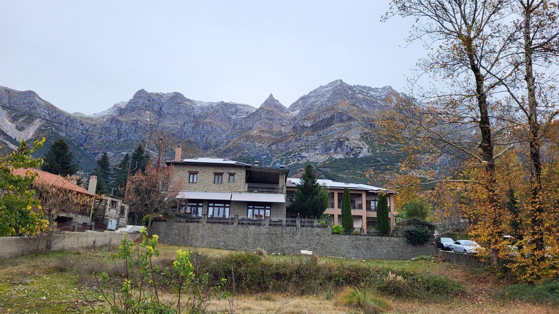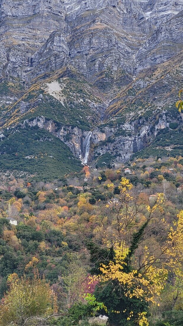 The location offers a unique view of the foothills of Tzoumerka and the valley formed by Arachthos, while the imposing peaks of the mountain range dominate above the waterfalls.